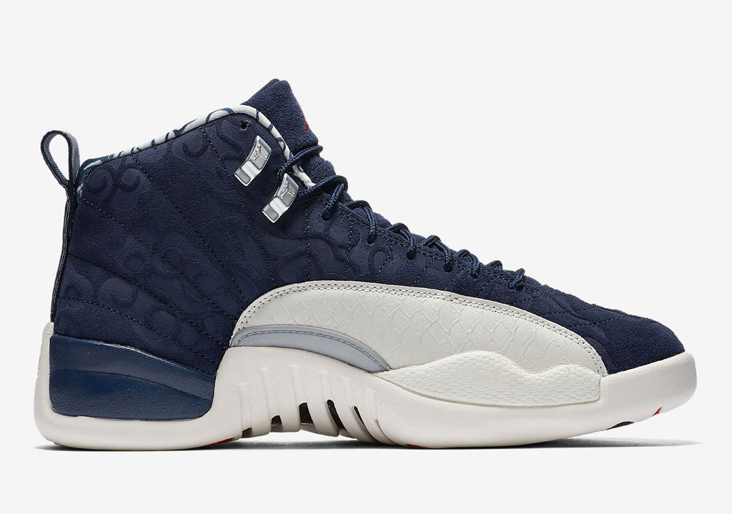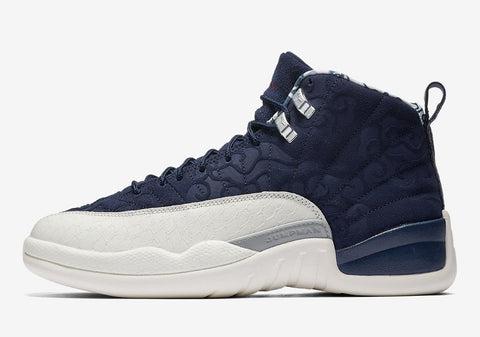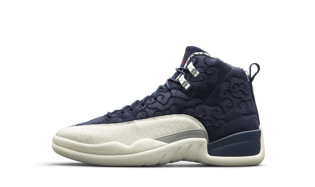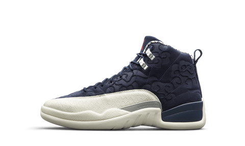 If you want some Js for jetsettin, look no further than these International Flight Jordan 12s. These 12s pay homage to Japan with design elements from the Japanese flag’s rising sun. Coming in a College Navy, Sail, and University Red color scheme, they feature an Obsidian upper covered in debossed floral print and a Sail reptile-textured leather overlay, printed inner lining, Red logos, along with Japanese lettering on the heel tabs completes the design. These dropped in September of 2018 and are a must Bid for true Jordan collectors.