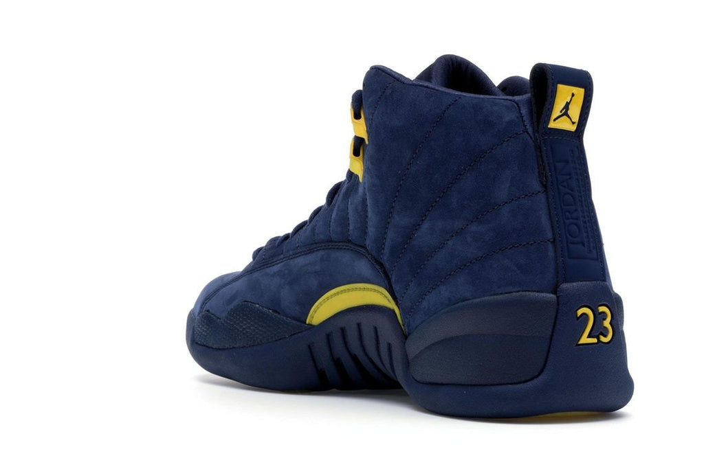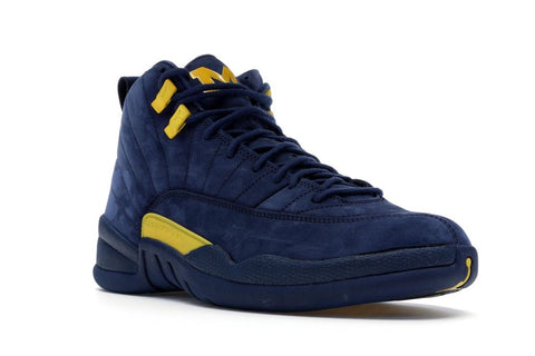 Calling all Wolverines fans: Hail to the victors! After seeing images circulating the internet for months, the Jordan 12 Michigan is finally out. They come in a Wolverine’s-inspired college navy and feature hits of Amarillo yellow. To complete the shoe, there is the standard Michigan "M" prominently displayed in Amarillo on the tongue.
